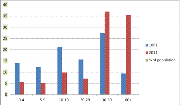 There were 535 males and 496 females. Unfortunately I missed two. Beyond age 30 there were more women than men. The numbers in the 30-39 age group look surprisingly small, but I have not investigated reasons. It may be of interest to observe that anyone aged 56 or over was born before the Battle of Trafalgar. We have some comparison figures based on the Office for National Statistics census of 2011, kindly provided by Mike Smith of the Somerset Intelligence Unit at the County Council. The chart shows the percentage of the population falling into various age groups. Age categories are adjusted to coincide with 2011 data. The total population in 2011 was 748, and the proportion of females has risen from 48% in 1861 to 52%.