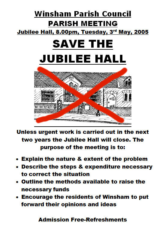 refused to contemplate. The Public Meeting was then arranged for the 5th May 2005, and this was promoted by poster and by a parish wide leaflet drop, and in the Parish Magazine. The meeting was held under the Chairmanship of Colin Slade, Chairman of the Winsham Parish Council. Supporting speakers were John Sullivan, Chairman of the Jubilee Hall Management Committee, Rod Wells FRICS, joint author of the Structural Survey, and Sarah Gleadell, a professional fund raiser, and Hon. Secretary of the JHMC. It started with a short introduction to the problem facing the village by Colin Slade. It was then followed by a more detailed explanation by John Sullivan and Rod Wells of what work needed to be done, why it needed to be done, the approximate cost and the means of fund raising that were available to the JHMC. Sarah Gleadell explained that grants from various sources were essential to the success of the project, as was the need to raise money from the community. Grants were unlikely to be obtained unless it could be proved that the community had made a substantial effort to raise money from within the parish. After a short break for refreshment, the members of the audience were invited to ask questions or express points of view. The possibility of establishing a new hall in another part of the village, alongside the commercial development of the hall into residential accommodation was discussed at some length. In the end it was discounted on the basis of cost. A new hall would cost about £500,000 to build and equip. By the end of the meeting, there was a general consensus in favour of the JHMC proceeding on the basis that they would aim to refurbish the hall to as good as standard as could be afforded, from fund raising. |