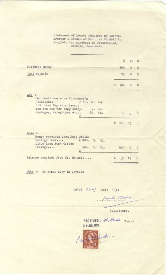 Record of Sale for Peterfield House, Winsham Auctioned at the George Inn, Winsham on 7th May 1959
