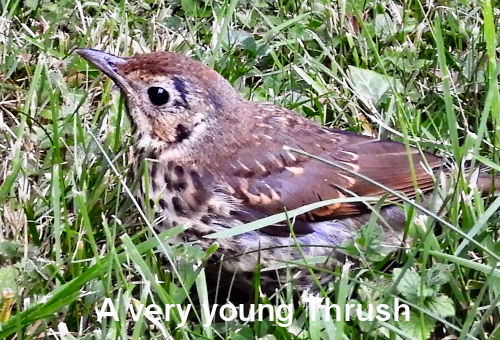 This young thrush, not long fledged, somehow got into the greenhouse.