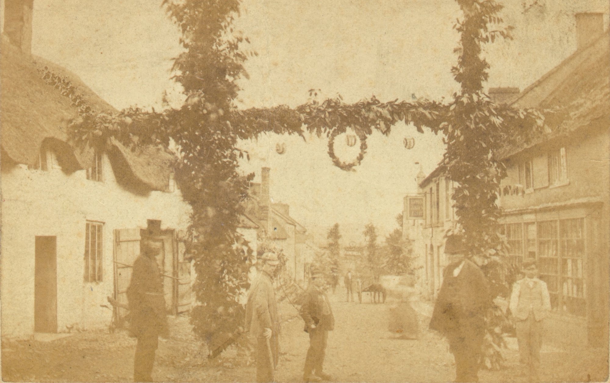 Farewell Celebration, c1870 At the far end of Church Street is a banner saying 'Farewell'. The street itself is dressed with traditional 'oaken boughs'.
